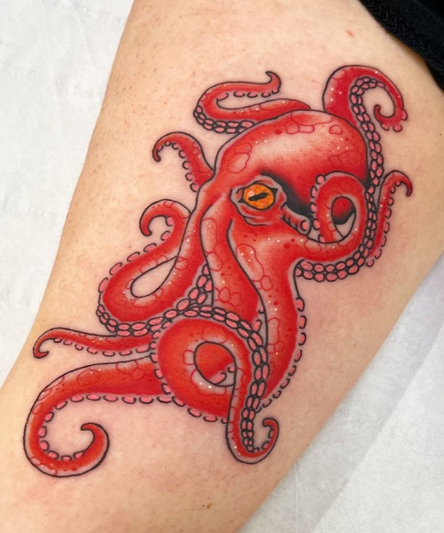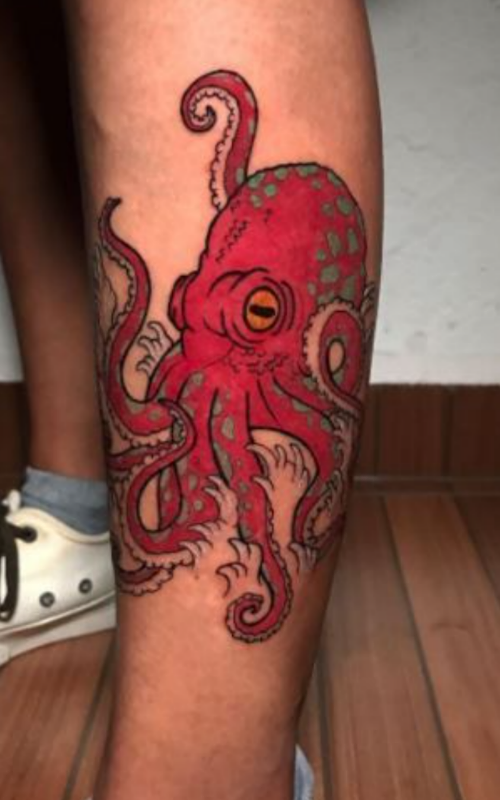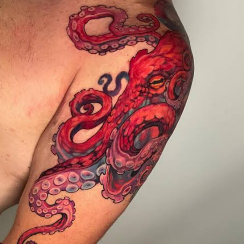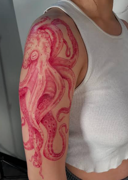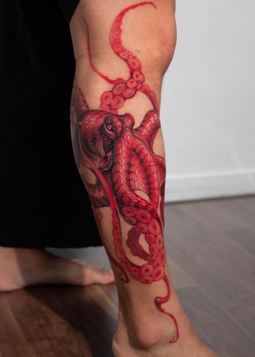 Level up your tattoo game with a cool red octopus tattoo, known for symbolizing intelligence, mystery, and strong survival instincts.