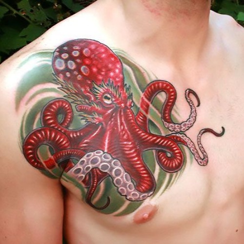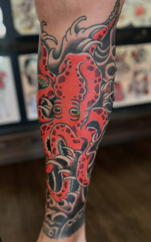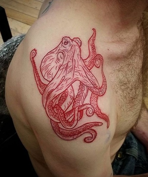 An octopus tattoo symbolizes mystery and resilience. When done in fiery red ink, it symbolizes intense adaptability and powerful transformation.