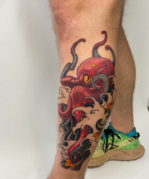 Do you like being a maximalist? Why not proceed with this sizable yet charming octopus tattoo on the leg?