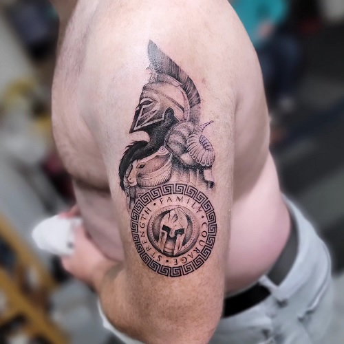 What does an intricately detailed Greek tattoo like this signify? It represents strength, courage, and triumph.