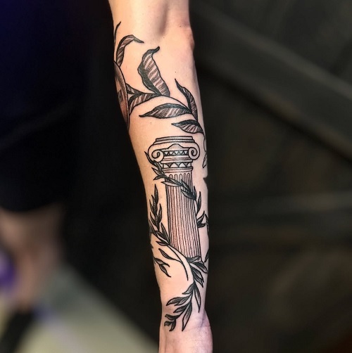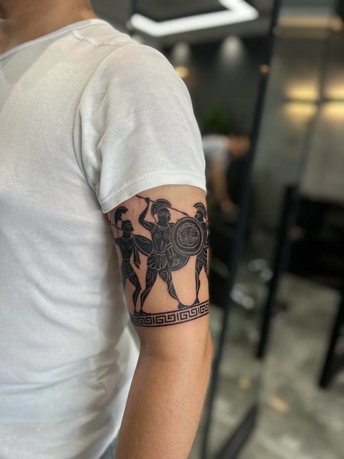 What does an intricately detailed Greek tattoo like this signify? It represents strength, courage, and triumph.