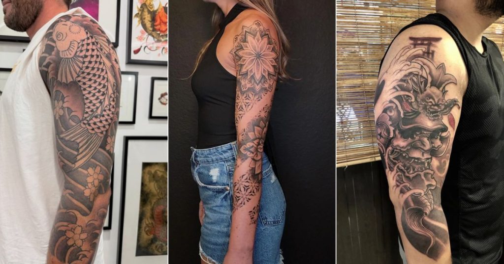 Let’s start with this beautiful sleeve tattoo art featuring a bold Aries tattoo at the top, surrounded by a shell, a moon, a mini star, and a crab to represent Cancerians.