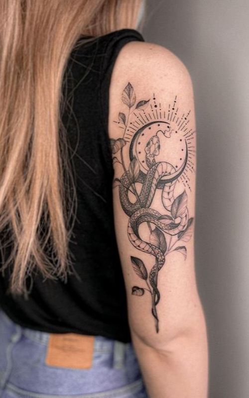Go for a beautifully designed and intricate snake tattoo that is wrapped around a crescent moon for that bold yet subtle look.