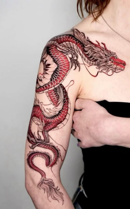 Here’s an extravagant red-dragon tattoo that symbolizes power, wisdom, and protection. Make sure to check out some more right here.