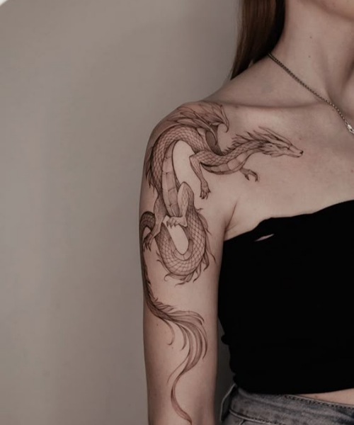 Get creative with your tattoo choices and get this tattoo done. The result is this excellent fine-line dragon.