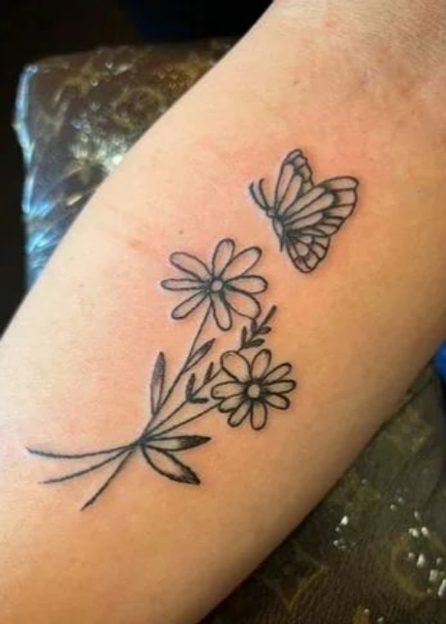 This daisy tattoo, along with a butterfly, is a powerful statement for those seeking a tattoo that symbolizes transformation, innocence, and hope.