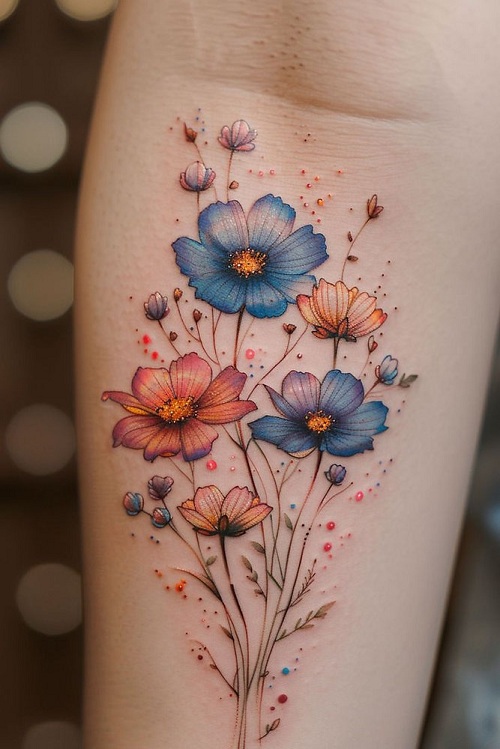 Nothing looks as pretty as a small flower tattoo—simply one of the cutest out there. The colors bring out your cheerful personality.