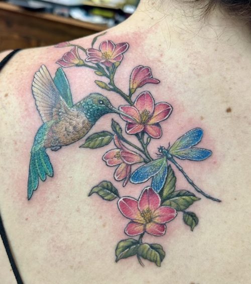 You need to see this pretty ink design of a dragonfly and hummingbird, along with these colorful flowers!