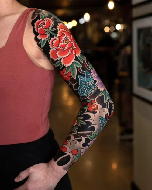 A black sleeve tattoo with colorful flora and fauna is one of the best ways to flaunt your arm.