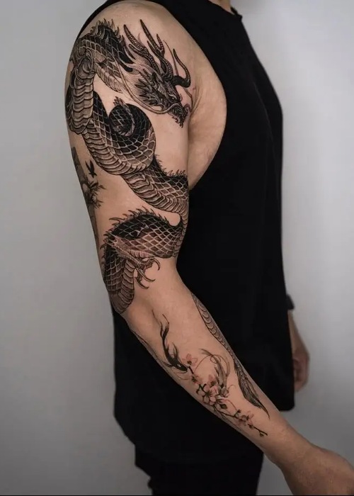 Well, here’s another version of a dragon tattoo, and this time it also has a cherry blossom and a koi fish near the wrist. Beautiful, right?