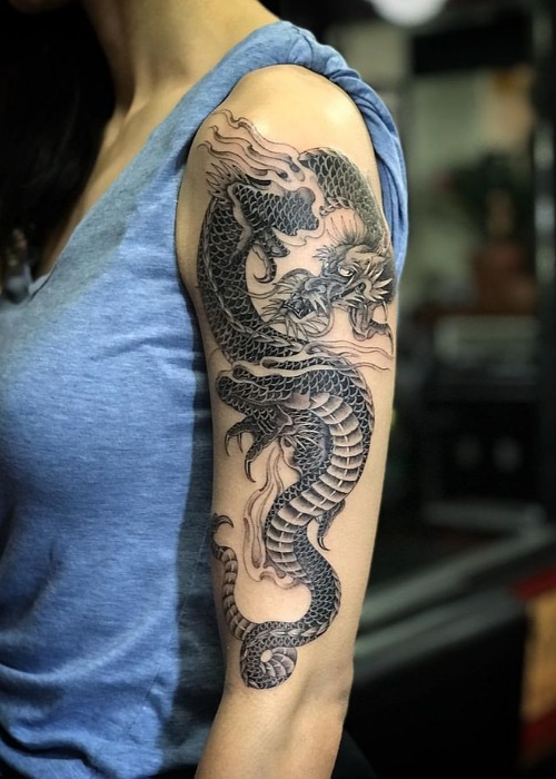 Go ahead with a creative arm tattoo featuring a dragon to symbolize strength, wisdom, and protection.