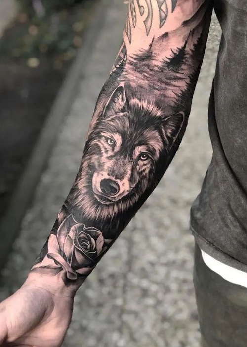 What does a tattoo with a wolf and a rose flower together symbolize? It embraces both power and sensitivity.