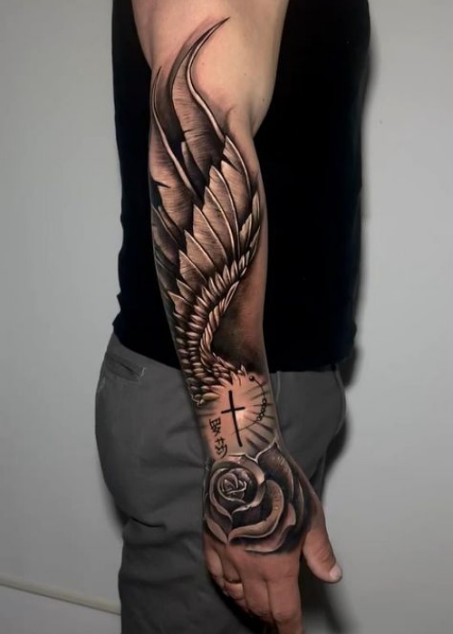 Consider getting a tattoo with designs like a rose, a large wing, a minimal Christian cross, and a personalized quote.