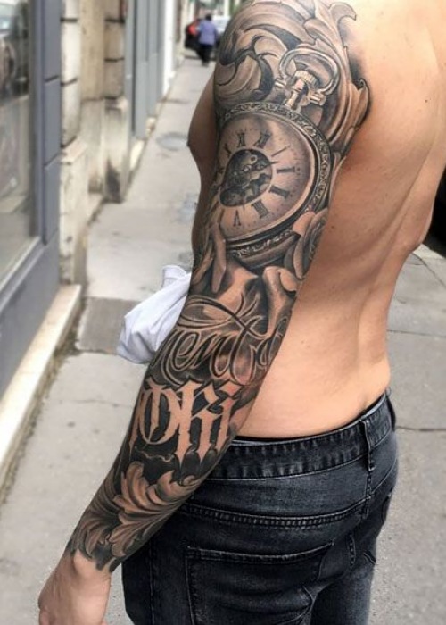 This piece is beyond breathtaking. The bold black ink, the filigree, and the clock all form a lovely sleeve tattoo.