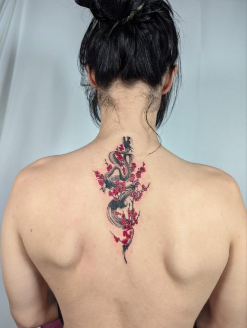 Here’s an eye-catching yet meaningful piece. The dragon wrapped in red flowers symbolizes power matched with grace.