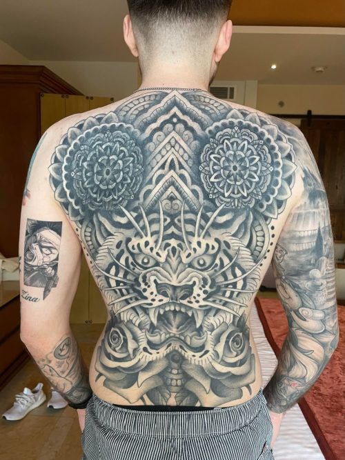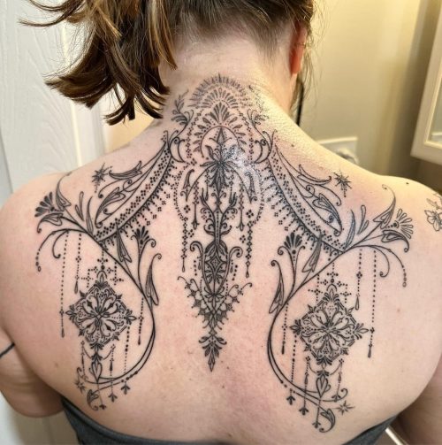 How about an intricate back tattoo with fine details that looks really beautiful? Did you like it?