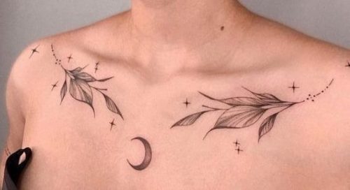 Once again, a dual collarbone tattoo idea: dainty leafy branches surrounded by tiny stars and the crescent moon is what stands out.