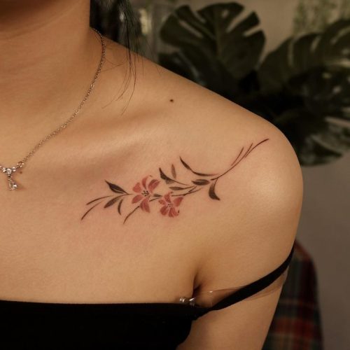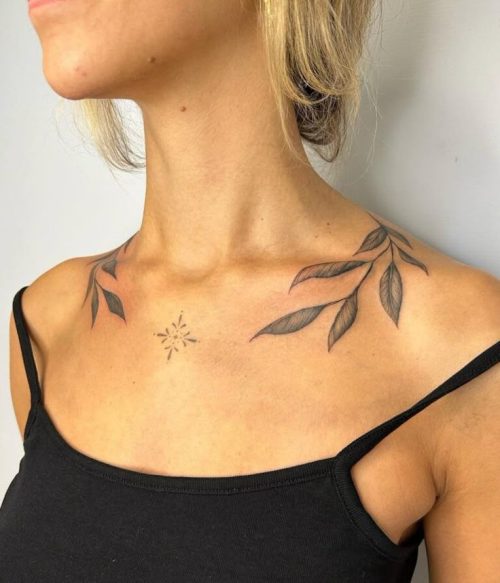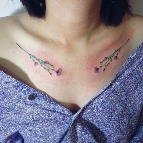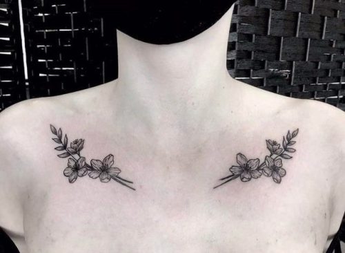 Try out this excellent body art. It has matching floral branches on both collarbones, creating a feminine look. Beautiful, right?