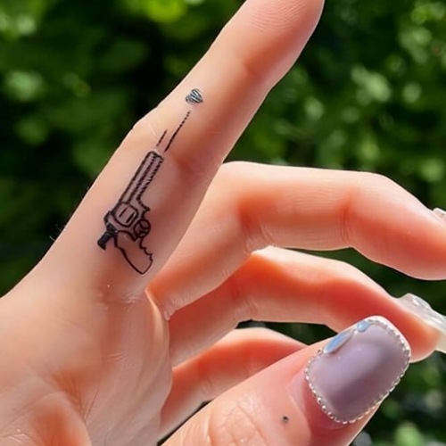 Let your creative side shine with this mini finger tattoo with a gun shooting out a heart. It can also be the perfect matching couple tattoo.