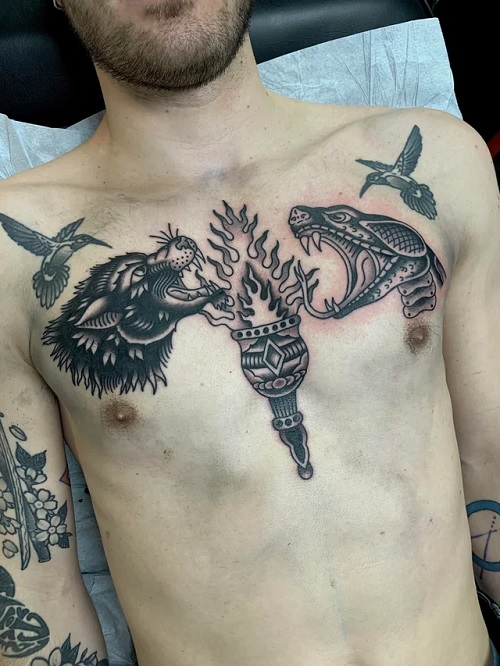 This fierce chest tattoo looks extra cool with the flame inked vertically in it. It truly is one of a kind.