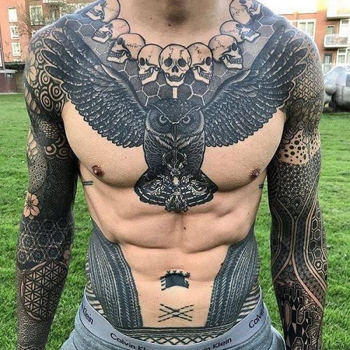 The owl and the skull neckline are beautifully presented in this chest piece. It is made in bold black ink, allowing you to see every detail vividly.