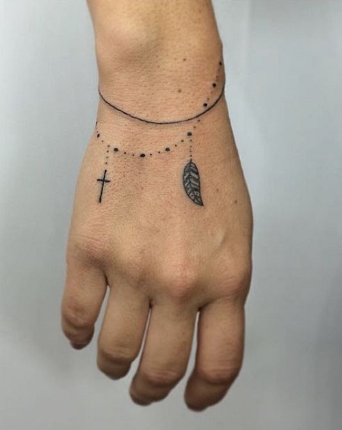 Here’s a dotted string that wraps delicately around your wrist, with a tiny cross and feather to make it beautiful.