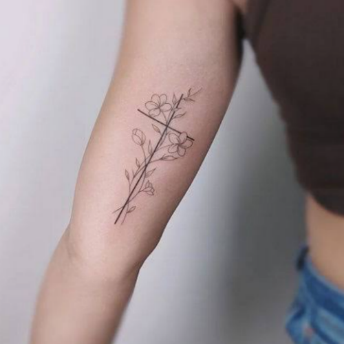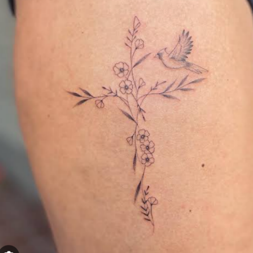 Why don’t you go for this tattoo that results in this feminine piece? The flowers are shaped like a cross, and the little bird is like a jewel on top.