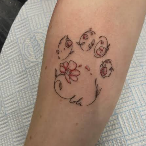 Try something different, like this paw tattoo decorated with flowers and a name. Isn’t it pretty?
