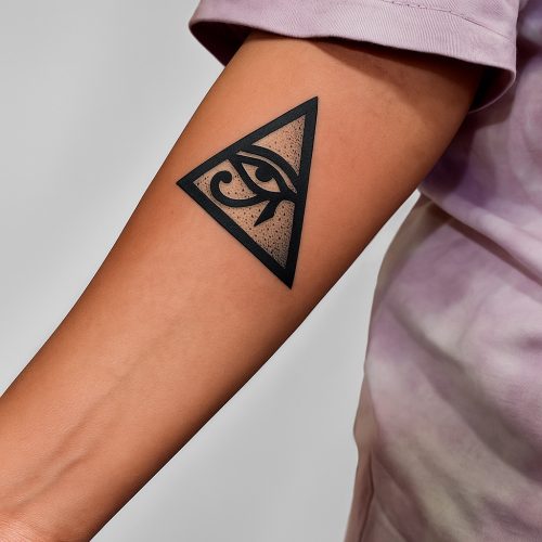 The Eye of Horus, in ancient Egypt, symbolizes protection, health, and restoration. Here’s one as a large forearm piece.