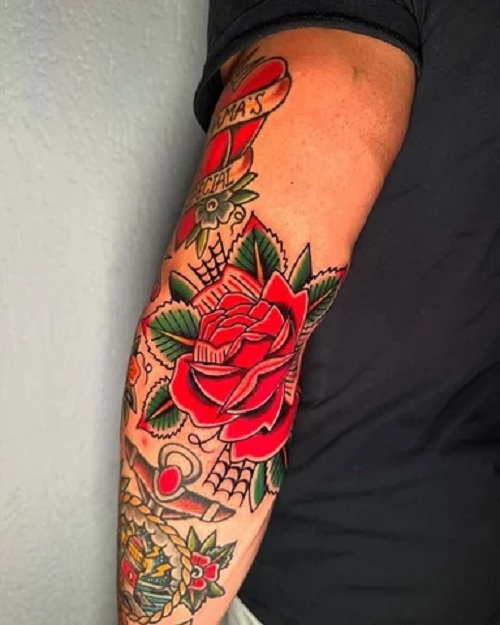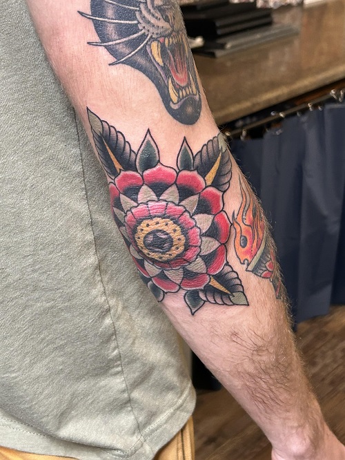Some people like to go maximal, just like this traditional-looking floral art. Get it done on your elbow to give it a place to call home.