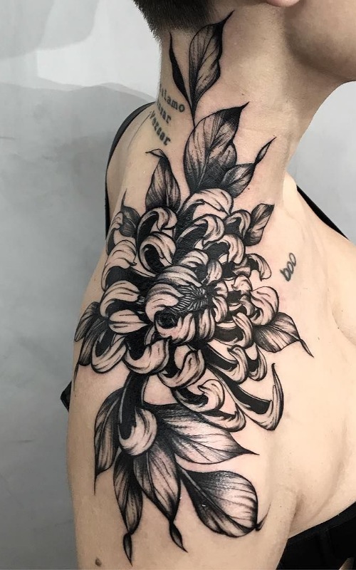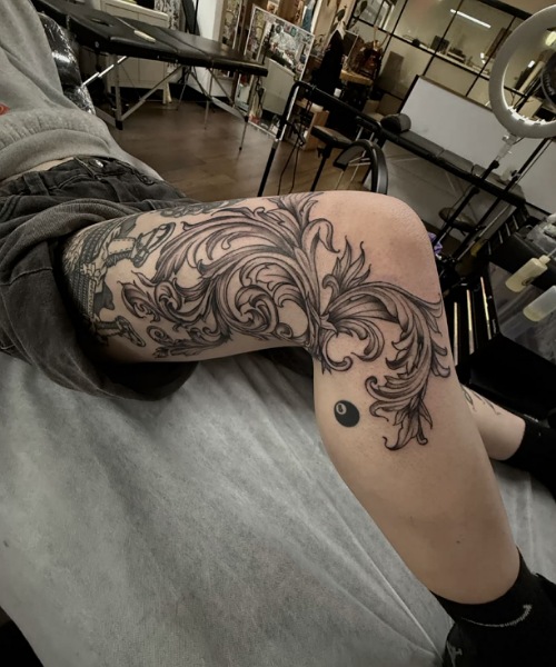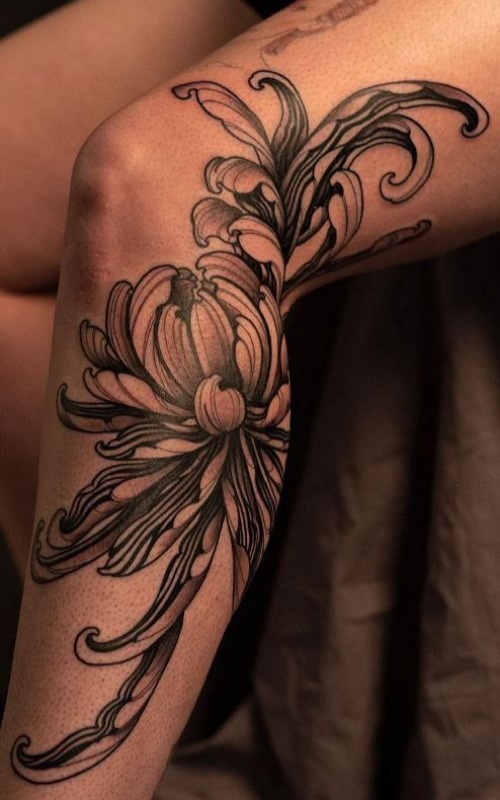 This chrysanthemum knee-framing tattoo will look lovely once it’s done. The perfect piece to catch eyes every time you step out.