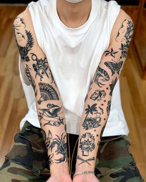 Why not go for an iconic sleeve tattoo? It decorates your arm with intricate small inks in detail.