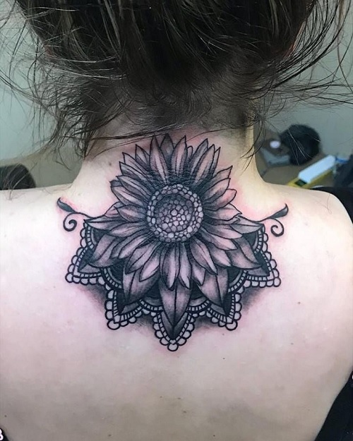 Why not a large flower on the back of the neck? It’s one of the most beautiful ones you can get and is going to catch eyes every time you wear backless tops and dresses.