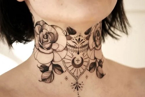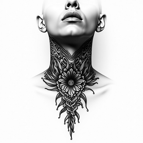 Try out this intricate and large floral neck pattern, perfect for those who wish to symbolize growth, love, and rebirth on themselves.