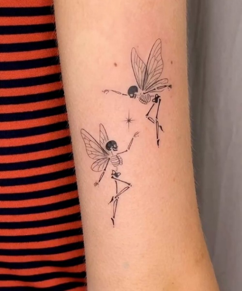 What can be better than the two skeleton fairies dancing on your skin? They look even better with the addition of stars around them.