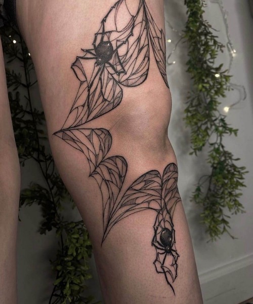 Get a spider web framing your knee, with spiders on it, to create a cool-looking design. Here are some more spiderweb tattoos for you.