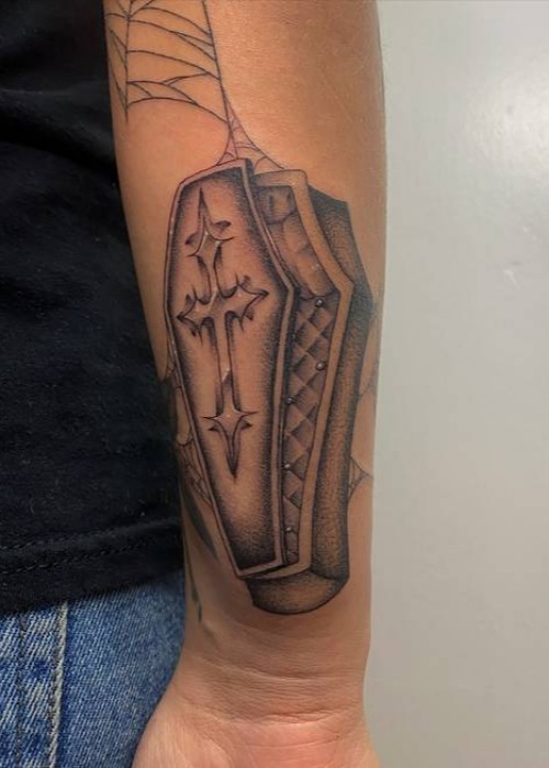 Let’s start with a coffin tattoo featuring a cross. It is the perfect tattoo idea to begin this guide with.