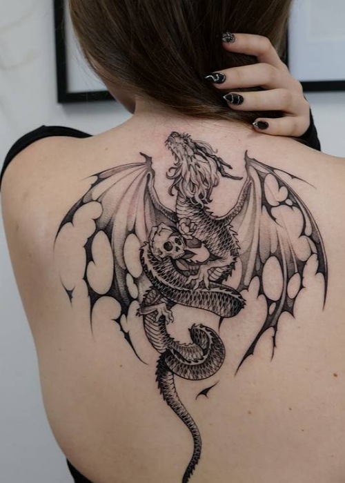 Here’s a cool one: a dragon holding a skull. Don’t miss out on this idea if you love some spine tattoos.