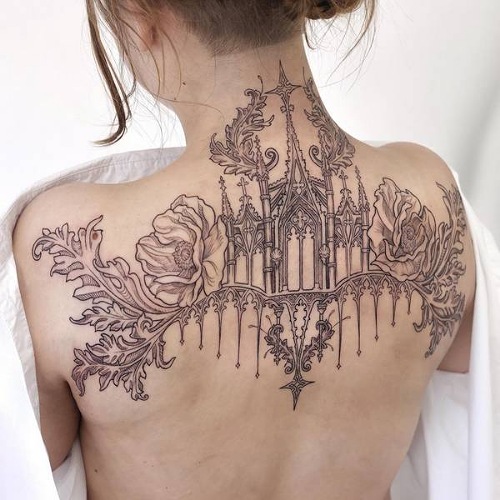 Go ahead with a baroque tattoo on the back that is big and eye-catching, with all the details on it.