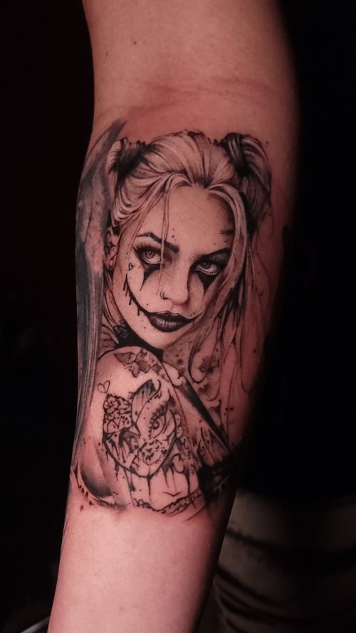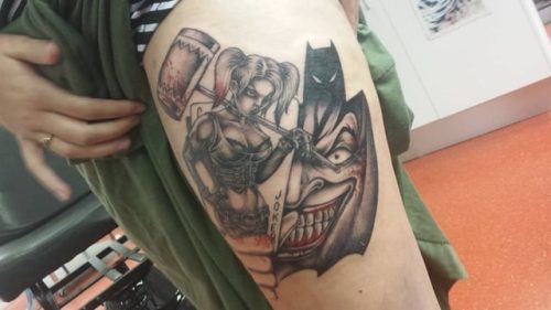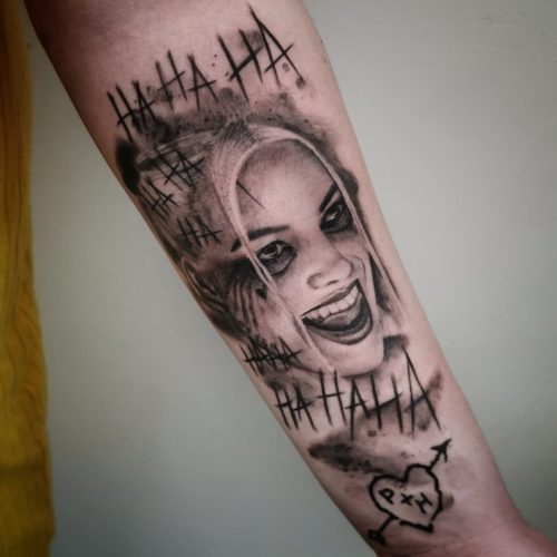 Go ahead with this black and grey iconic Harley Quinn tattoo. It is surrounded by multiple “HA HA,” and a “P+H” in a heart.