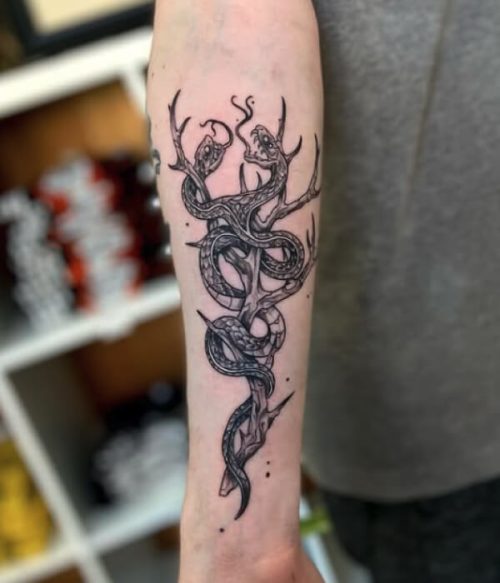 The perfect way to end a poison tree tattoo is with this deadly-looking art. Ideal for the upcoming Halloween parties.