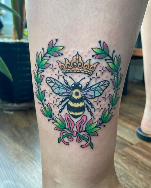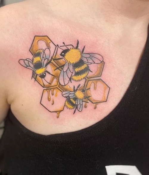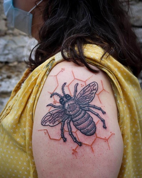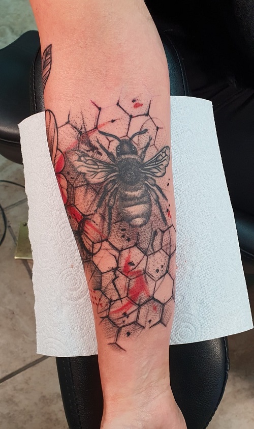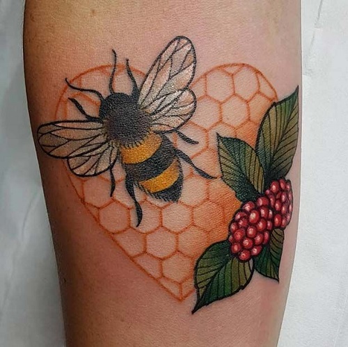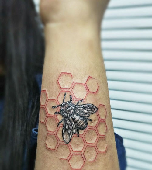 Let’s start with this bold bee tattoo design featuring red honeycombs, symbolizing your determination to complete tasks.