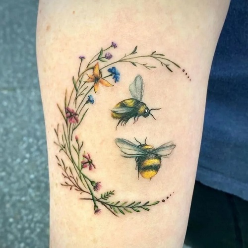Extensive, intricate, and adorned with large bees and large petals, this tattoo will be perfect for you if you want to flaunt your bicep.