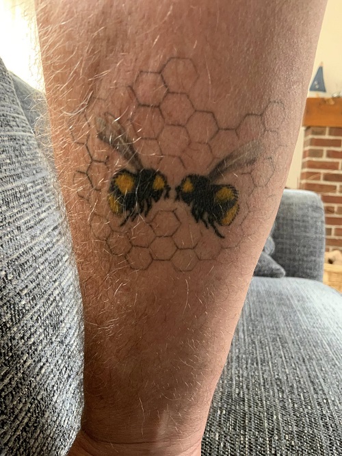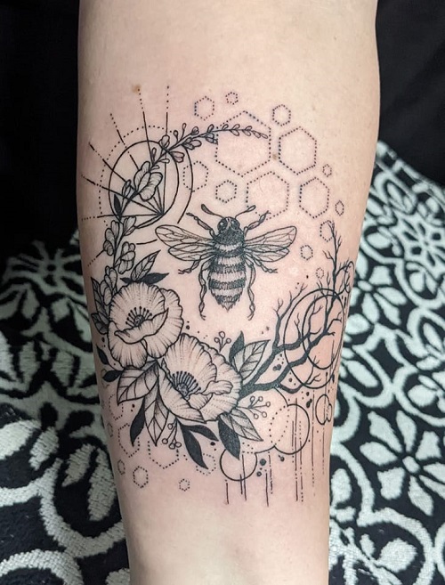 Time for a cool-looking ink idea. Add colors and flowers to your bee and put it on a frame-style honeycomb around it for an eye-catching look.