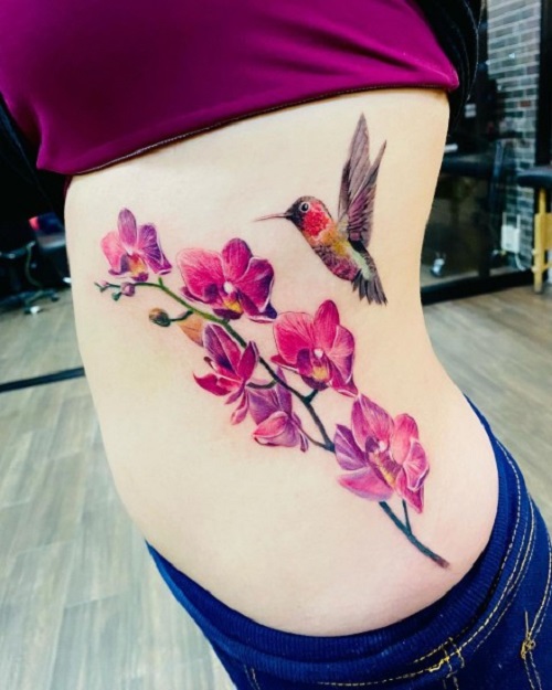 Many people get this colorful side-body art with lovely florals and a buzzing hummingbird. Here are some more floral tattoos for you.