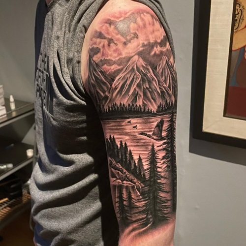 As the name suggests, this tattoo captures the beauty of nature in its rawest form—towering peaks, still lakes, and trees that tell stories of adventure.