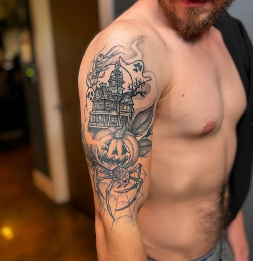 A Halloween half-sleeve tattoo is a thrilling way to show off your favorite holiday, and here is a cool one with a Jack O’ Lantern, a spider, and ghosts.