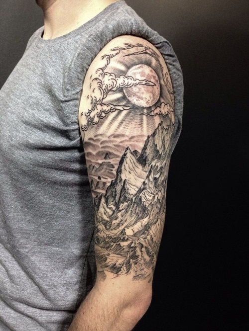 This tattoo beautifully blends two contrasting elements—the majestic mountains standing tall with a radiant moon behind the clouds.