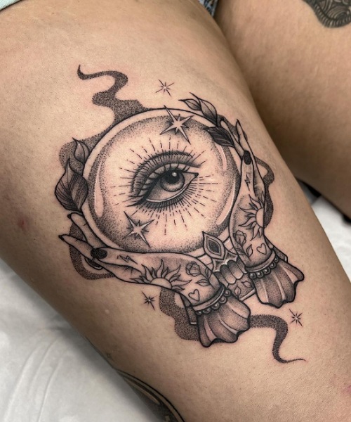 Let your thigh be a sketchbook when you can ink magical inks. This one will look even better when paired with our witchy tattoos.