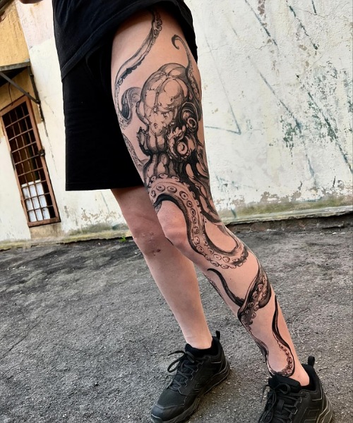 Get a maximalist design on your leg and choose to decorate it with this octopus. Perfect for the ocean lovers.